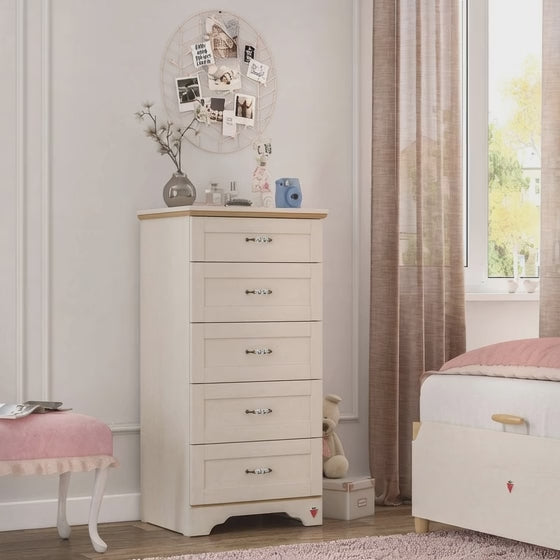 Nëse keni një hapësirë të kufizuar në dhomën tuaj, por keni nevojë për më shumë hapësirë për të ruajtur sendet tuaja, atëherë komoja e larte Flora  është për ju. Me 5 sirtarë me mentesha me frenim automatik, kjo komo me formën e tij të ngushtë dhe të gjatë ofron hapësirë të mjaftueshme për sendet tuaja dhe gjithashtu ju jep më shumë hapësirë lirie në dhomën tuaj. Dhe gjithashtu, me tërë elegancën e tij... Me këndet e rrumbullakëta dhe pajisjen për montimin në mur, ai rrit sigurinë e fëmijëve tuaj.
