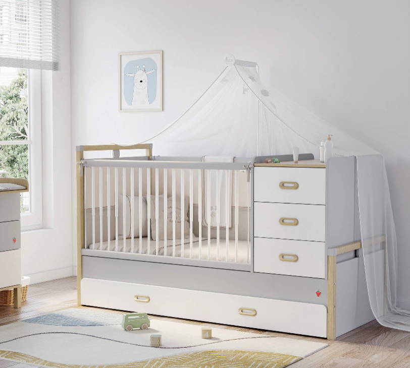 Krevati që Rritet me Bebët Kur bebi rritet, nuk dëshiron të humbësh asnjë moment dhe ai/ajo gjithmonë ka nevojë që ti jesh pranë tij/saj. Veçanërisht gjatë gjumit, sirtari me rrota për prindërit poshtë ofron një opsion për të qëndruar pranë tij/saj. Ju keni një vend të fshehur në dhomën e bebit për të fjetur ose për të përdorur si hapësirë për depozitim. Krevati për beba, me dizajnin e thellë dhe të gjerë, krijon hapësirën e sigurt për gjumin duke ofruar një lehtësi përdorimi për prindërit me veçorinë e liftit teleskopik dhe sirtarët që ndodhen në fund të krevatit .. Tashmë krevati po ju shoqëron edhe në këtë aventurë rritjeje. Krevati  për Beba Mino Baby, me pjesën që mund të hiqet me sirtarë dhe raftë, rikonfiguron hapësirën e gjumit duke ofruar një dizajn kohor që mund të përdoret pa ndryshim për shumë vite. Krevati është 80x130 cm për periudhën e bebit dhe mund të përdoret nga 0-3 vjeç, ndërsa për periudhën e fëmijërisë mund të zgjerohet deri në 80x180 cm.Krevati ka kapacitetin e ngarkesës së maksimumit prej 80 kg. Krevati  dhe sirtari i poshtëm janë të përshtatshëm për madhësinë e dyshekut 80x177 cm dhe setet gjumi 80x130 cm, dhe mund të përdoren për shumë vite me cilësinë e tyre të mirë. Shënim: Tekstilet, dysheku dhe aksesorët e tjerë të shfaqur në figurë nuk janë përfshirë në çmimin e produktit.