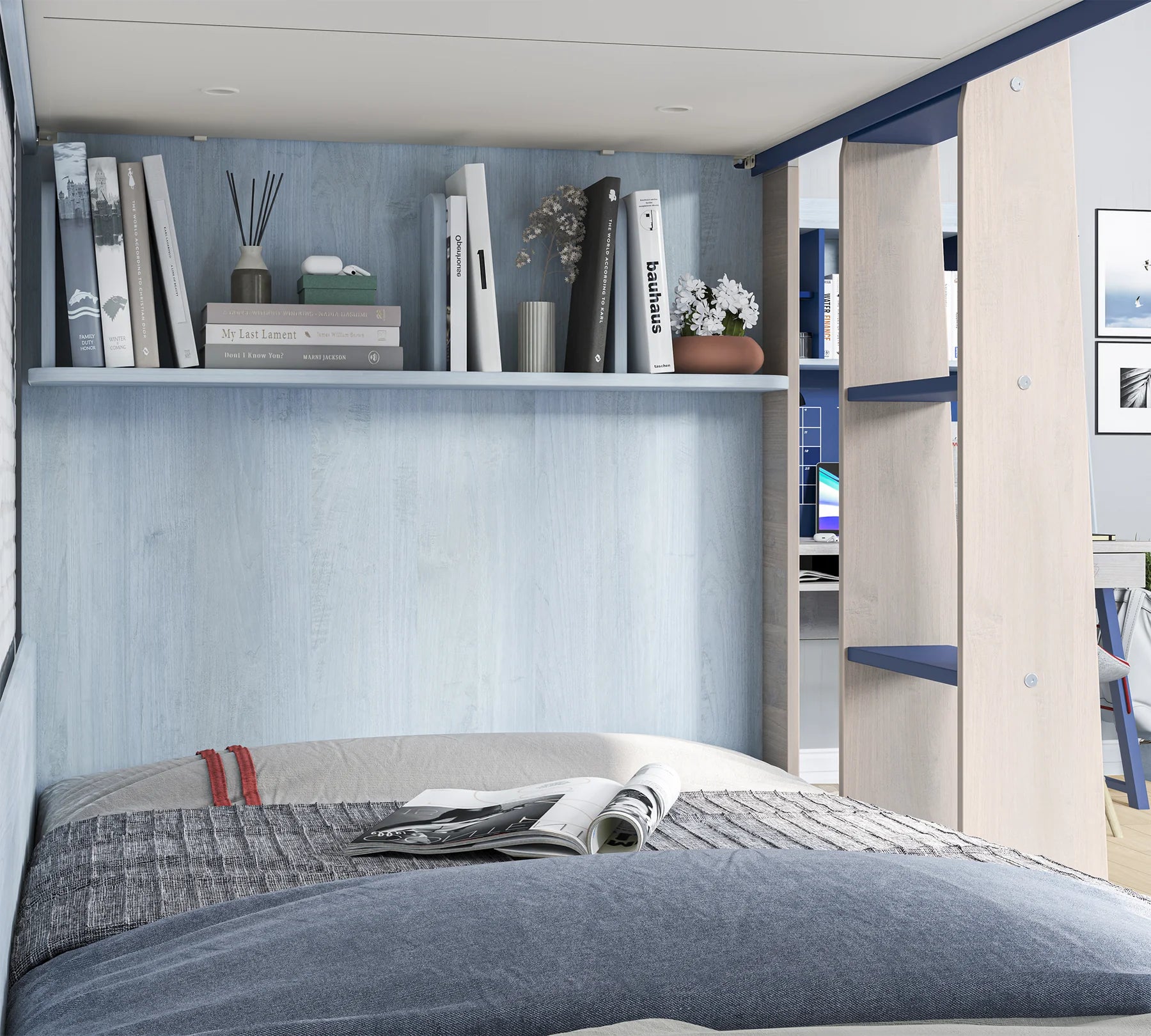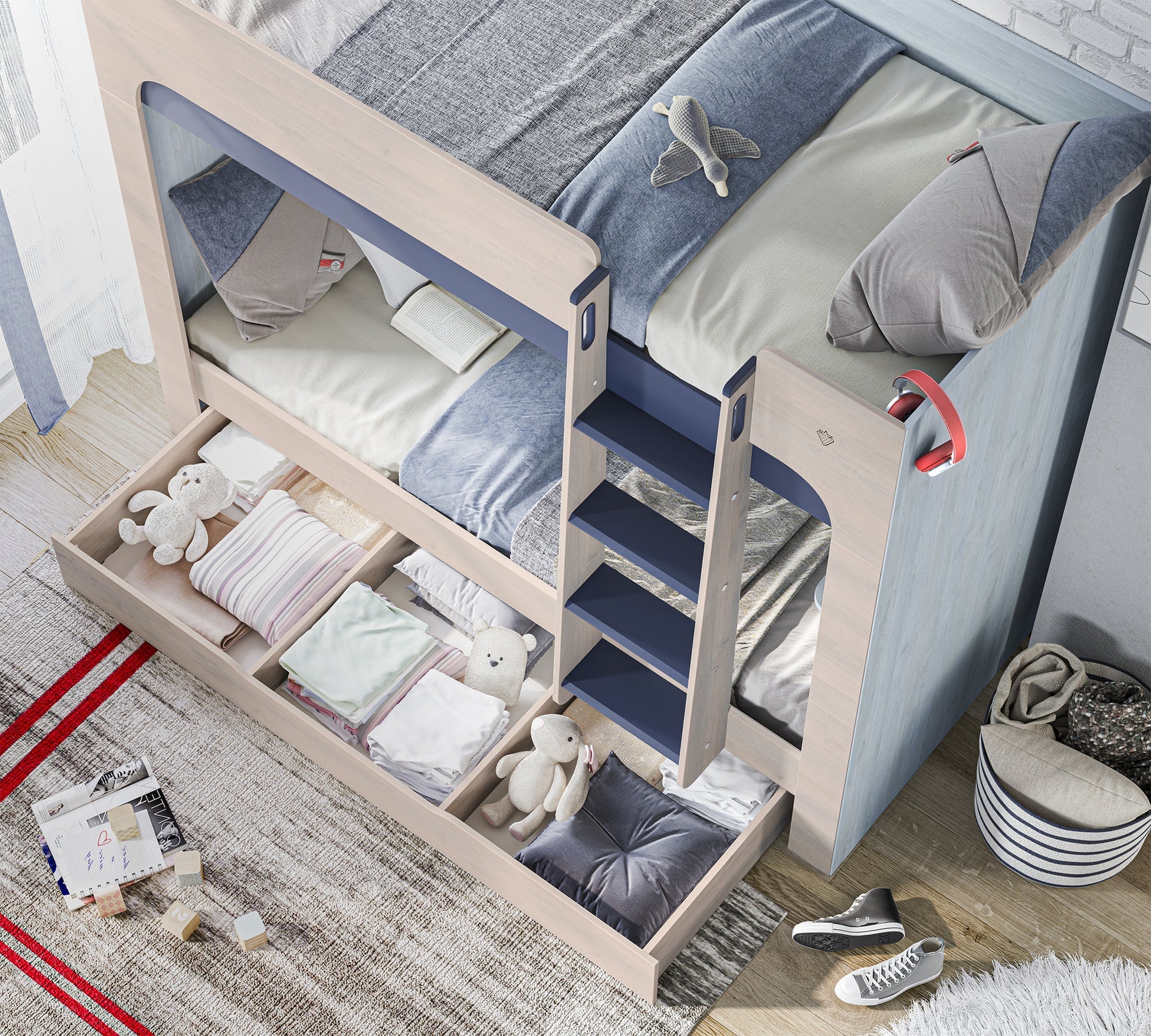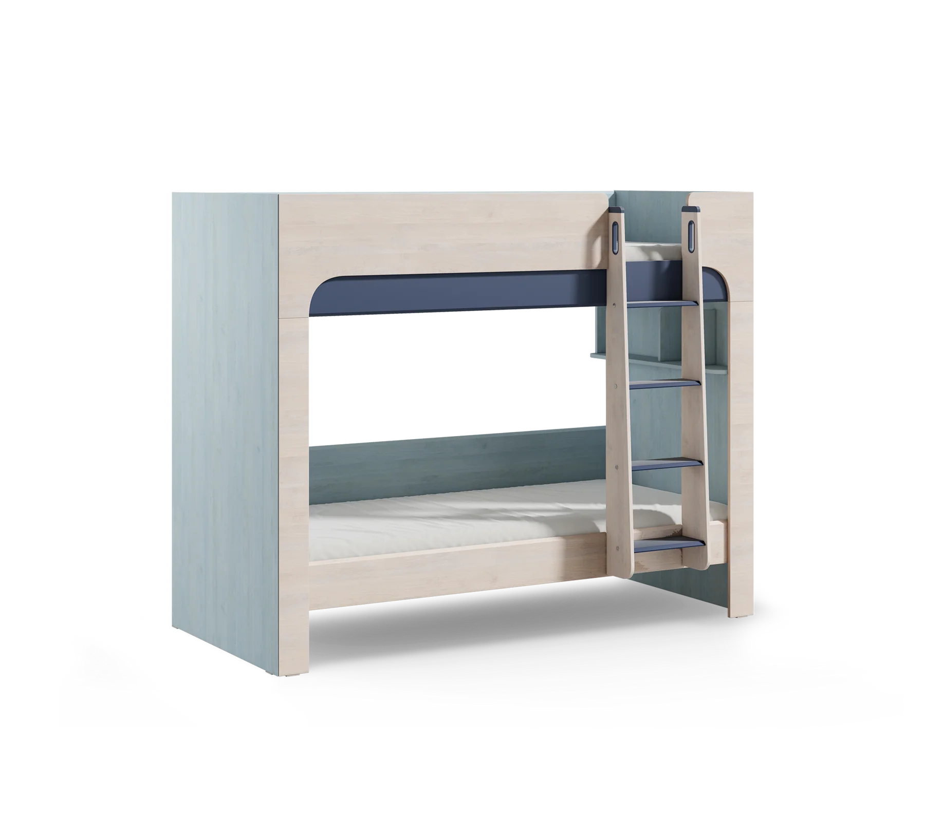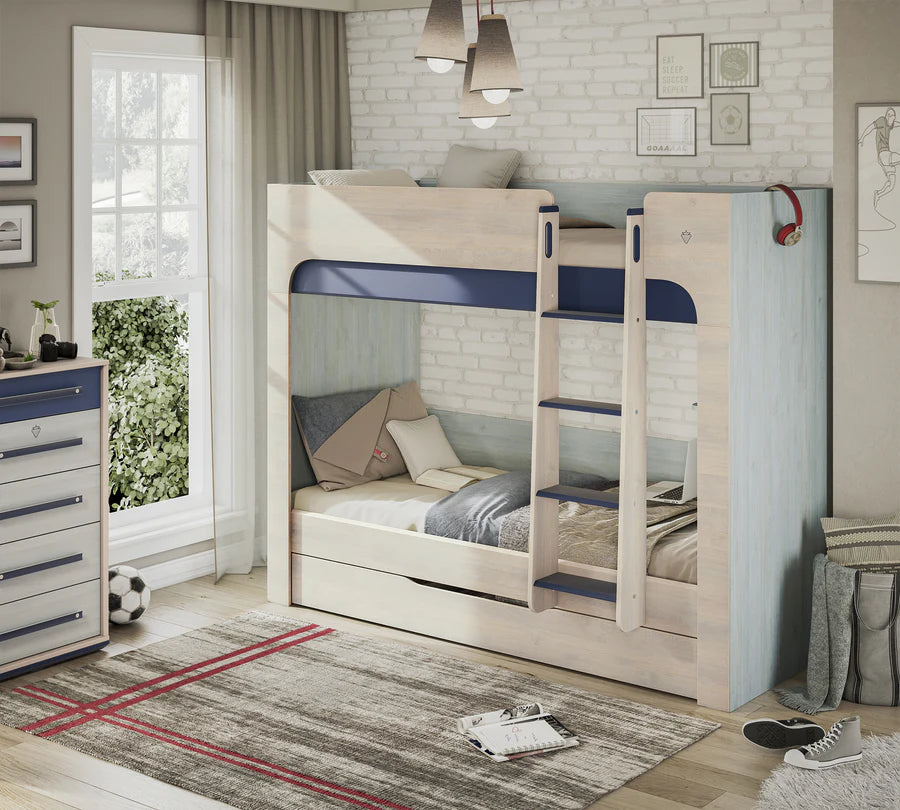 sjell zgjidhjen perfekte për dhoma të vogla dhe të organizuara. Dizajni i tij kompakt shfrytëzon hapësirën në mënyrë optimale, ndërsa struktura e fortë dhe detajet e sigurisë e bëjnë të përshtatshëm për fëmijët. Me përmasat 90x200 cm, ofron një hapësirë të bollshme gjumi, ndërsa parapetet anësore, shkallët e sigurta dhe format e rrumbullakosura sigurojnë përdorim të qetë dhe të sigurt.