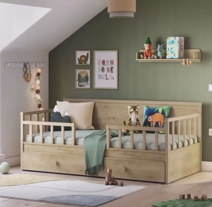 • Mbrojtëse sigurie në tri anë - Garantojnë siguri gjatë gjumit. Mbrojtësja e përparme është e lëvizshme dhe mund të hiqet kur fëmija rritet dhe nuk ka më nevojë për të.