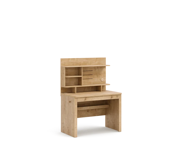 sjell ngrohtësi dhe funksionalitet në dhomën tuaj me tonet natyrale të drurit dhe dizajnin e saj kompakt. Pjesa e sipërme me rafte dhe ndarje ju mundëson të organizoni në mënyrë të rregullt librat, fletoret dhe sendet personale, duke krijuar një ambient të pastër dhe praktik për punë apo studim.