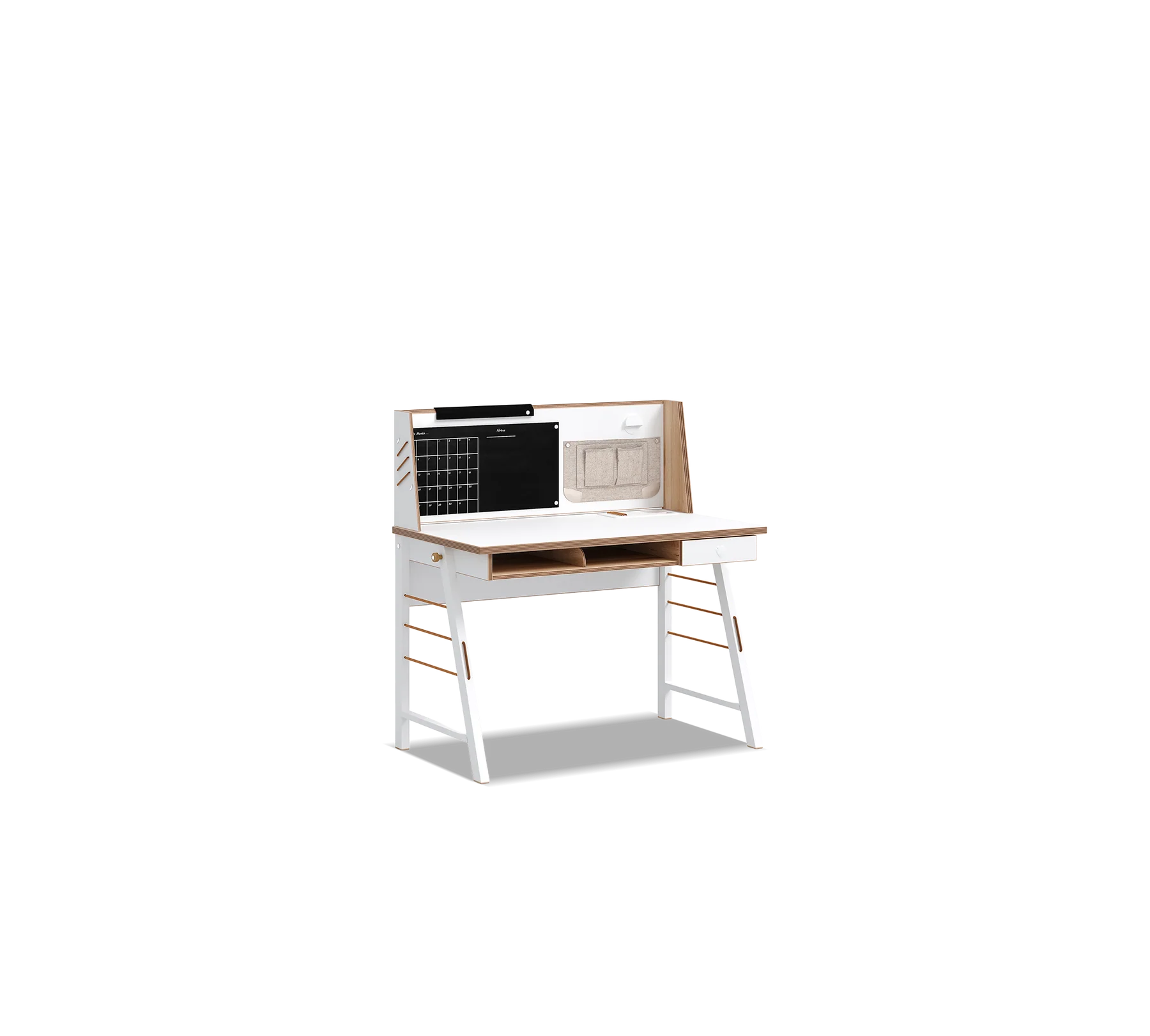 Rafti i hapur me 2 ndarje, i vendosur poshtë hapësirës së punës, lejon qasje të shpejtë te sendet e përditshme si libra, axhenda apo materiale studimi. Këmbët metalike në të dy anët i shtojnë tavolinës një pamje moderne dhe një strukturë të fortë. Mbi to ndodhen mbajtëse për të varur çantën, kufjet apo sende të tjera personale. Shiriti elastik i vendosur mes këmbëve ka funksion zbutës ndaj goditjeve dhe reduktues të zhurmës.