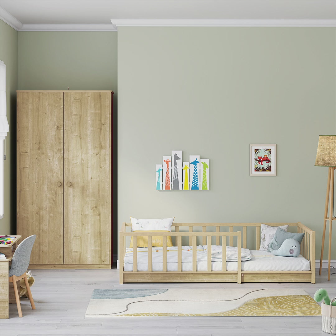 Me parmakë mbrojtës në tre anë dhe një dizajn të ulët afër tokës, ky shtrat synon të ofrojë një përvojë të sigurt gjumi për fëmijën tuaj.