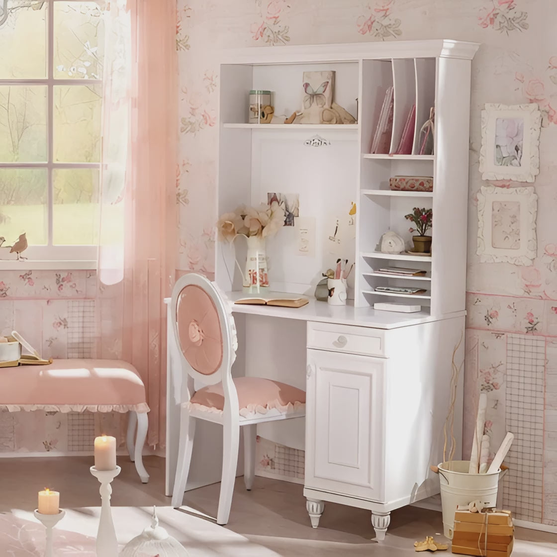 Tavolina e Studimit Romantica, me dizajnin e saj elegant dhe modern në ngjyrë të bardhë, përshtatet për çdo dhomë fëmijësh, duke krijuar një hapësirë të rehatshme dhe funksionale për studime.