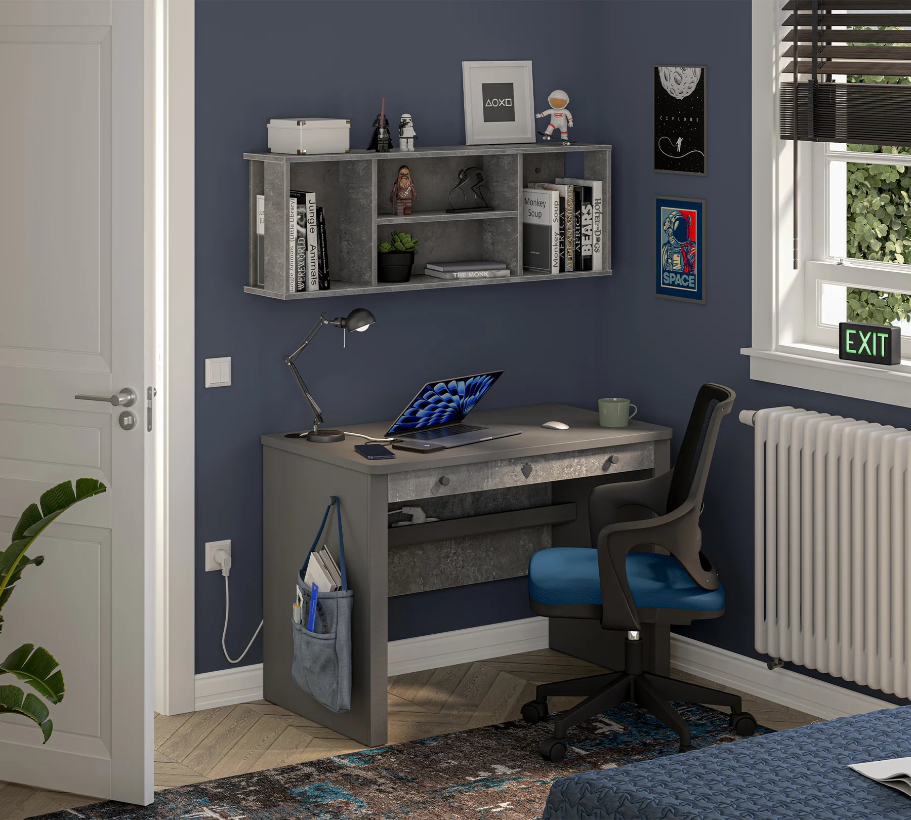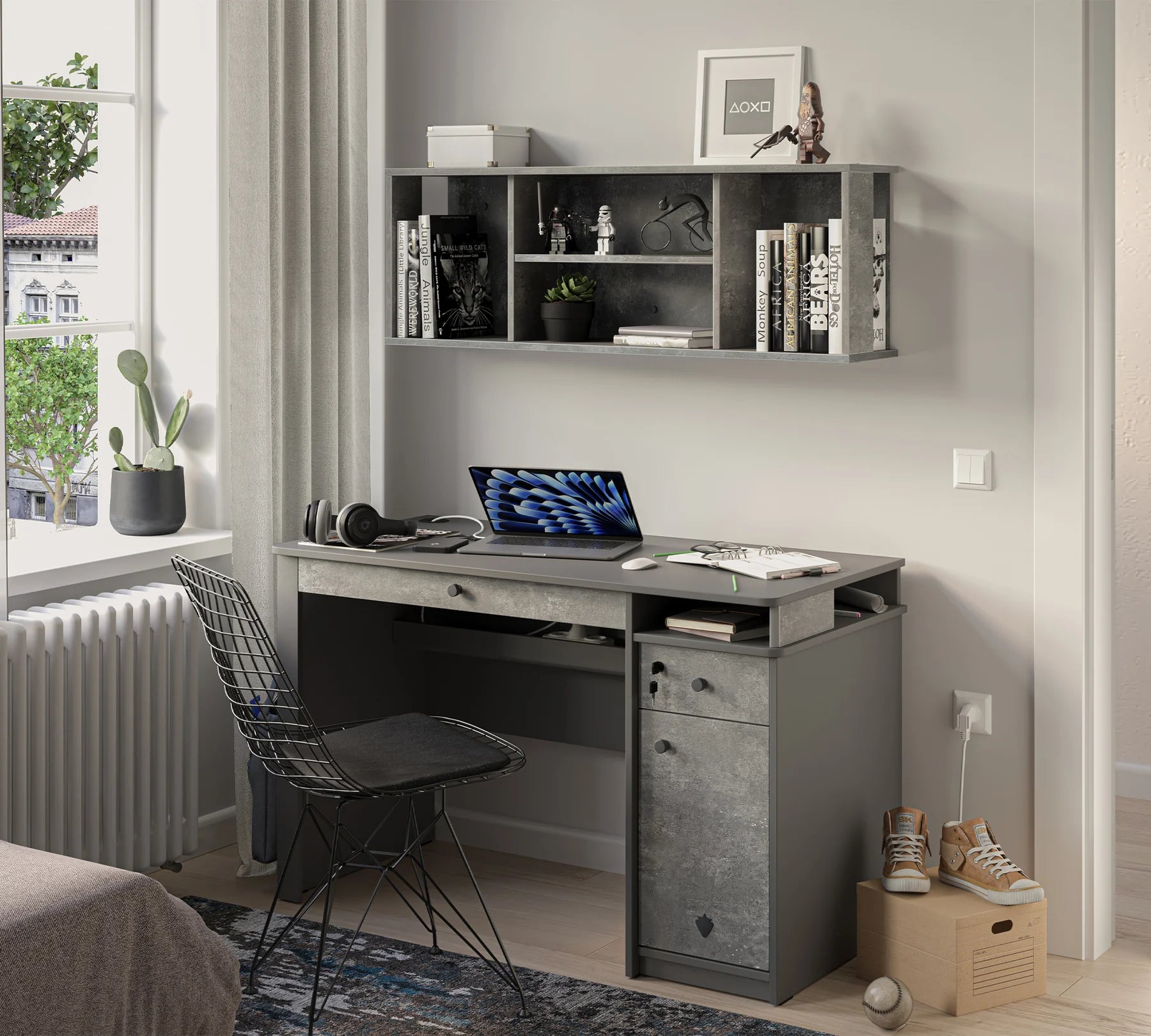 Me një stil modern dhe linja të thjeshta, tavolina e gjerë e studimit nga Space Gray krijon një hapësirë të organizuar dhe të rehatshme për të rinjtë. Falë përmasave ergonomike, ofron përdorim komod edhe gjatë qëndrimeve të gjata, ndërsa dy sirtarët dhe ndarja me kapak ndihmojnë në mbajtjen e rregullit për sendet e përditshme.