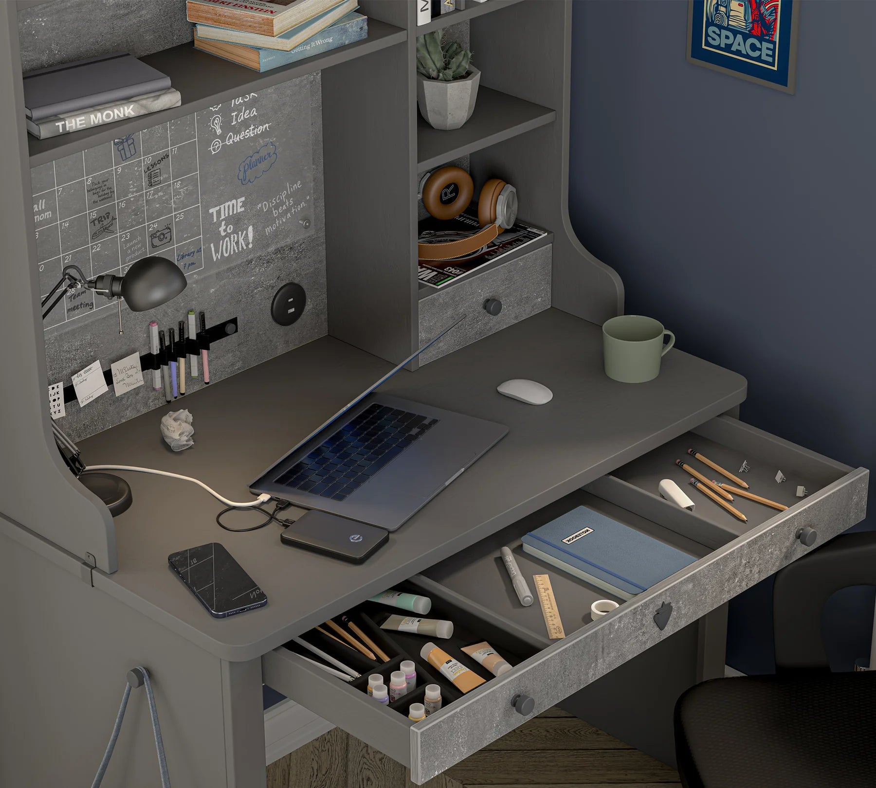 E krijuar për ata që duan një kënd pune modern dhe praktik, tavolina e ngushtë nga Space Gray dallohet me formën kompakte dhe detajet funksionale. Me linja elegante dhe stil të thjeshtë, ajo përshtatet lehtë në çdo ambient, duke ofruar një hapësirë pune të rregullt dhe të këndshme. Falë përputhjes së plotë me njësinë e lartë të studimit, ju mund ta zgjeroni këndin tuaj të punës sa herë që keni nevojë.
