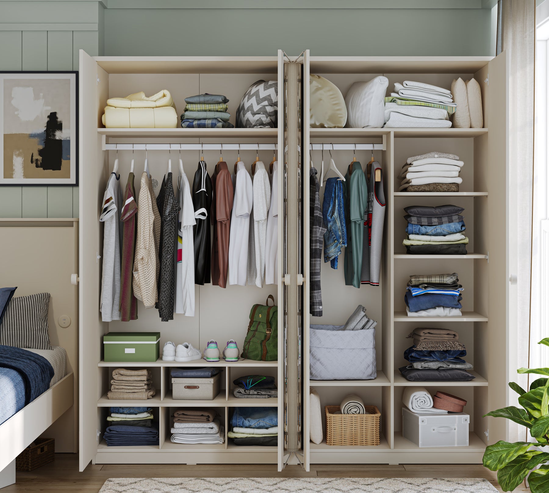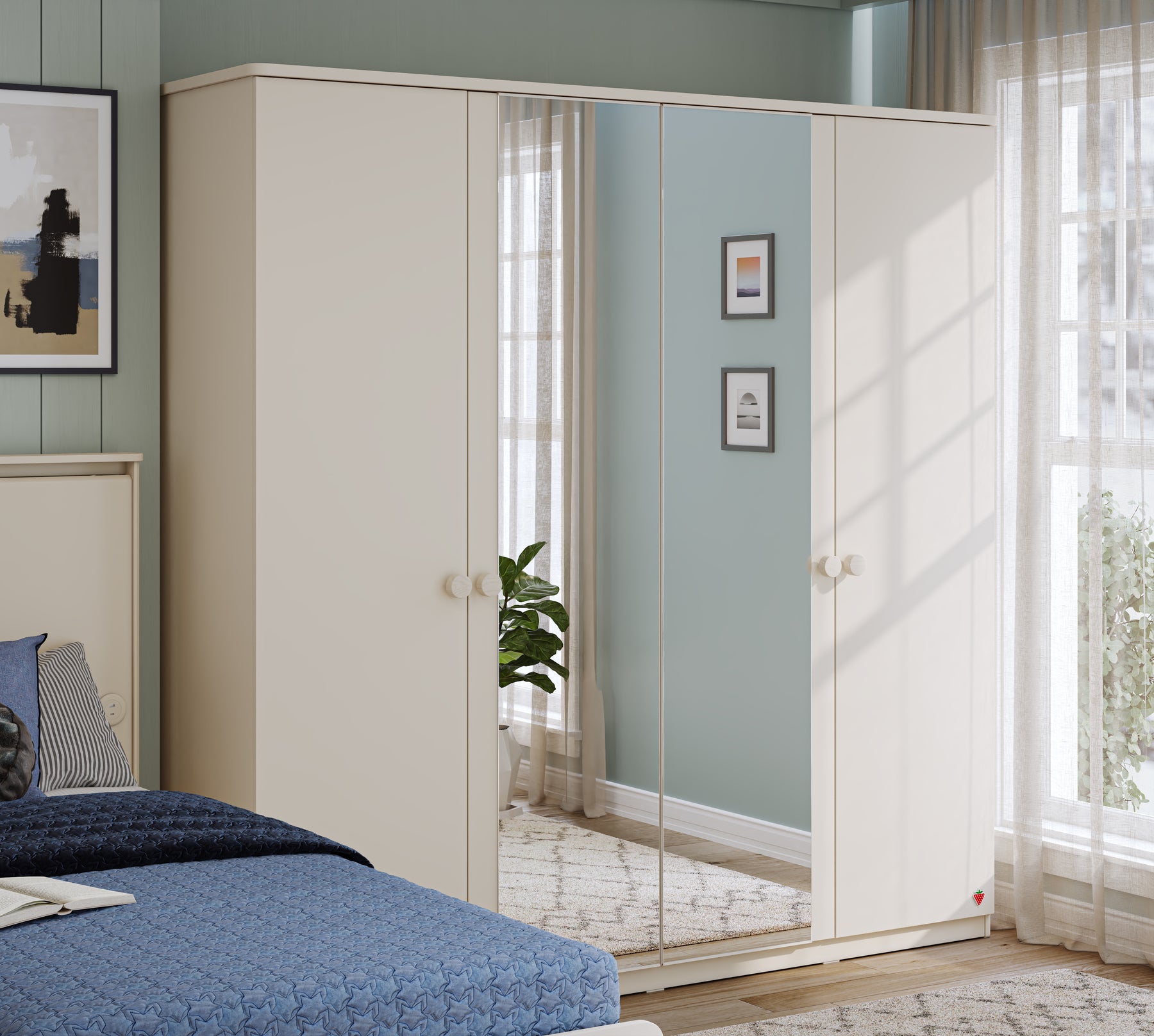 Dollapi me 4 dyer përfshin pasqyra në dyert qendrore, dy shufra varëse dhe rafte të bollshme. Vjen me mentesha me frenim, doreza druri, kapak ventilimi dhe aparat për lidhje në mur.