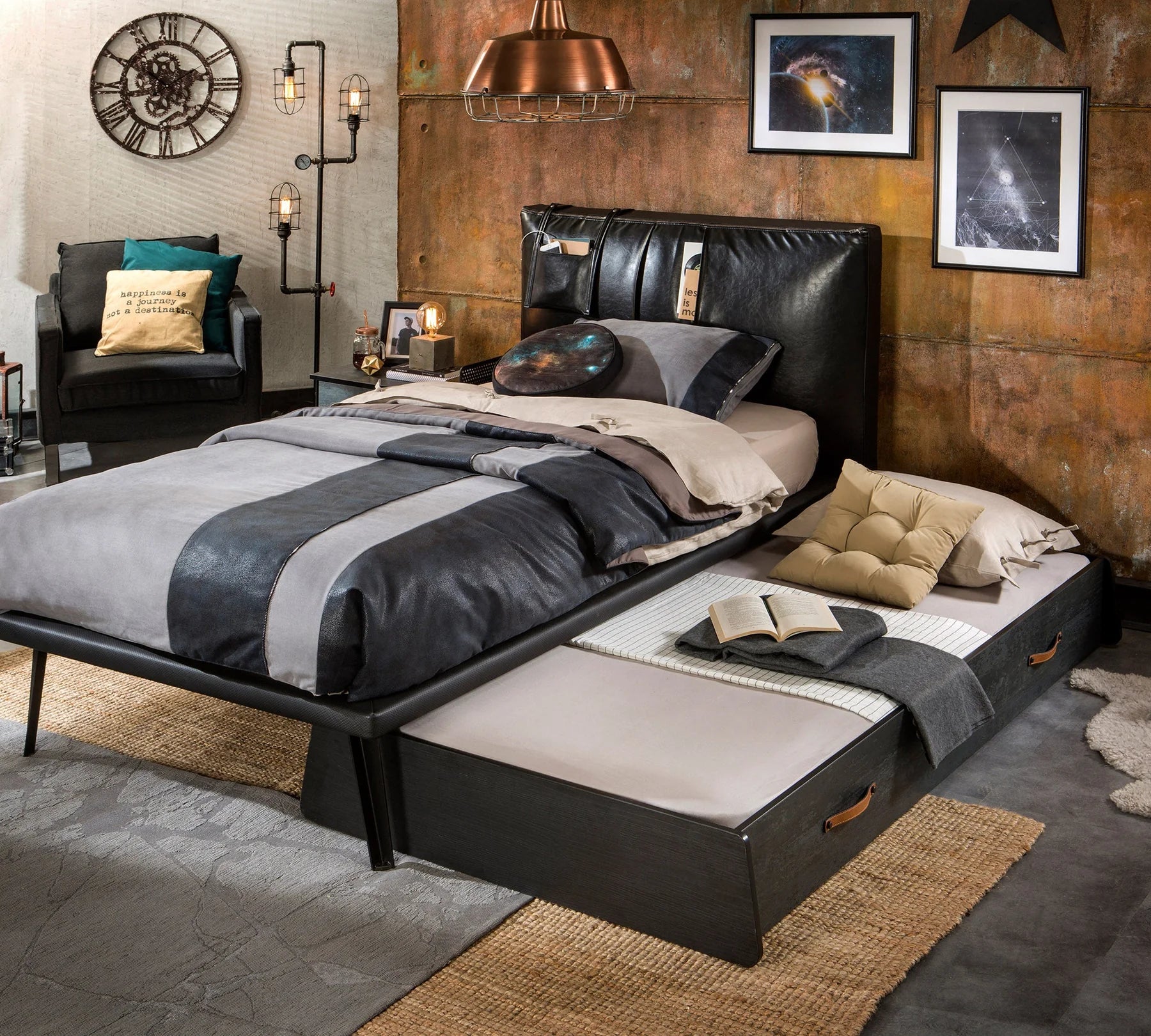 Krevat Dark Metal, i disponueshëm në përmasat 100x200 cm dhe 120x200 cm, sjell një prekje të ngrohtë në dhomat e adoleshentëve me kokën e tij tërheqëse dhe të rehatshme. Dizajnuar për t'u kombinuar me pjesët e tjera të koleksionit Dark Metal, ky model ka një kokë të mbuluar me lëkurë dhe qepje të kujdesshme, duke përfshirë edhe një xhep të punuar me dorë për sendet personale.