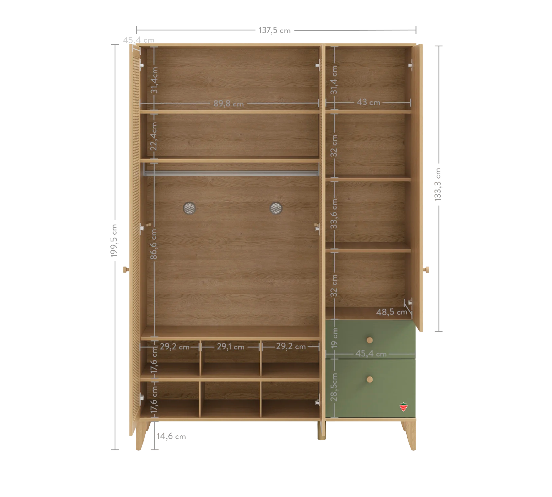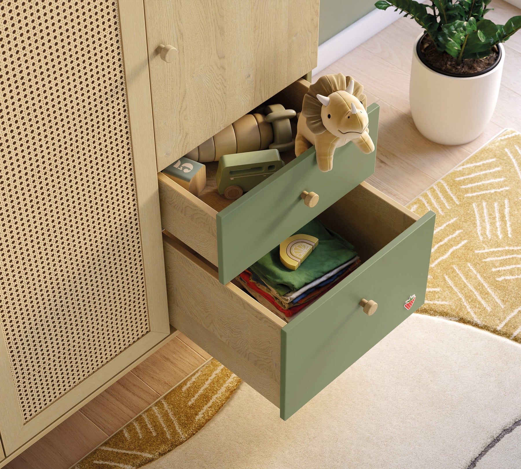 Kur beba juaj rritet, ka nevojë për shumë gjëra. Çorape, body, lodra... Seria Loof Baby ka raftet me shumë shtresa, varëse dhe sirtarë, ku gjithçka që ju nevojitet për të rritur beben tuaj është në vendin e duhur. Dyert e dollapit janë të pajisura me  mentesha  ngadalësuese dhe sirtarët kanë shine ngadalesuese , që i bëjnë ato të hapen dhe mbyllen lehtësisht dhe pa zhurmë. Për më tepër, janë shumë të sigurta kundër aksidenteve / bllokimeve . Me qoshet e rrumbullakëta dhe aparatin e fiksimit në mur, mund të përdoret me siguri nga foshnjëria deri në fëmijërinë.